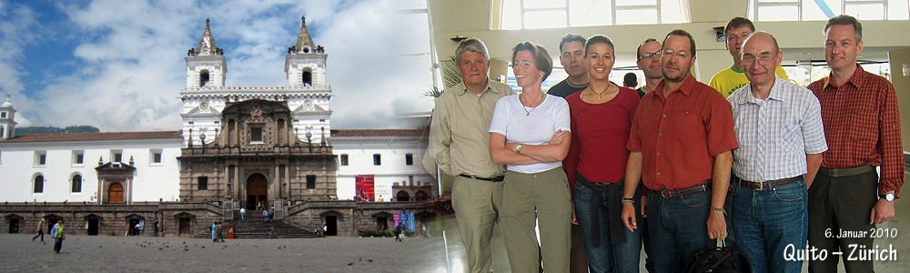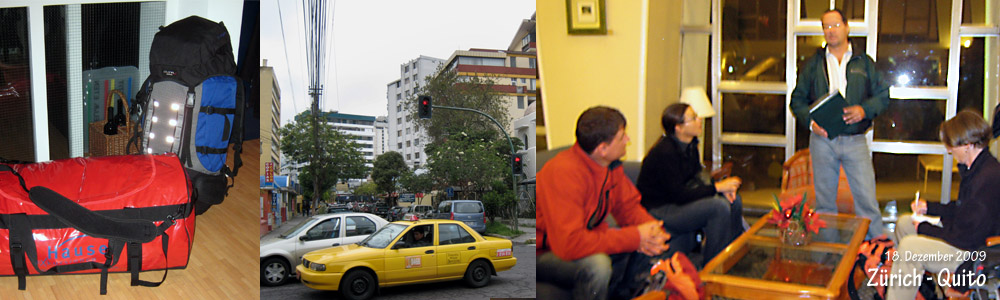 Unsere Reise startete an einem kalten Freitagmorgen im Dezember, als Götti-"Bub" Reto uns um 4.30 Uhr von Luzern nach Zürich Kloten brachte. Der Flug von Zürich nach Madrid verlief problemlos und war pünktlich. Auf dem Anschlussflug von Madrid nach Quito kamen aber 2 von 8 Gruppenmitgliedern und eines unserer Gepäckstücke nicht mit. Letzteres traf am nächsten Abend und die 2 Herren trafen am übernächsten Abend ein. Aber seither blieb die Gruppe komplett und hat keine grösseren Verluste mehr erlitten.
