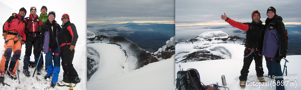 Beim Anseilplatz war Norma trotz alter Steigeisen als erste fertig, und Bergführer Patrizio nahm sie alleine ans Seil. Wegen der ca. 30cm Neuschnee vom Vortag war der Anstieg und das dazugehörende Spuren anstrengend und schwierig, besonders im oberen Teil, wo die Hänge immer steiler wurden. Patrizio begründete seinen Spurdrang aber mit der "Schweizer" Bergerfahrung seiner Kundin und der Grösse der Seilschaft; "lean and mean". Norma flucht und schimpft eigentlich nie, aber sie hat noch nie so oft "Scheisse" gesagt, wie auf dieser Tour, was von Patrizio jeweils mit einem Lachen beantwortet wurde. Enfin, nach 5 3/4 Stunden stand die 2-er Seilschaft als erste an dem Tag auf dem Gipfel des 5'897m hohen Cotopaxi, der wie jeder Vulkan bereits weit unter dem Gipfel schon recht nach Schwefel roch. Einige Fumarolen waren im Krater zu sehen und der Himmel war bewölkt, aber die Sicht war gut.