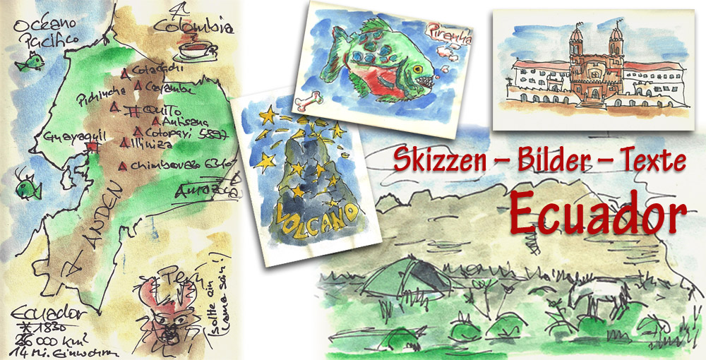Ecuador liegt im Nordwesten von Südamerika, grenzt an Kolumbien, an Peru, am Pazifik und wird im Norden des Landes vom Äquator durchquert, daher der Name. Es ist ein Land grosser Vielfalt: Schon Alexander von Humboldt meinte vor ca. 200 Jahren, dass die einzige Konstante in der Geografie Ecuadors seine Vielfalt sei. Von den 4 völlig unterschiedlichen geografischen Landeszonen; Costa = westliche Küste, Galapagos Inseln = 1'000km vor der Küste, Sierra = Anden, Oriente = Amazonas, haben wir letztere 2 besucht.