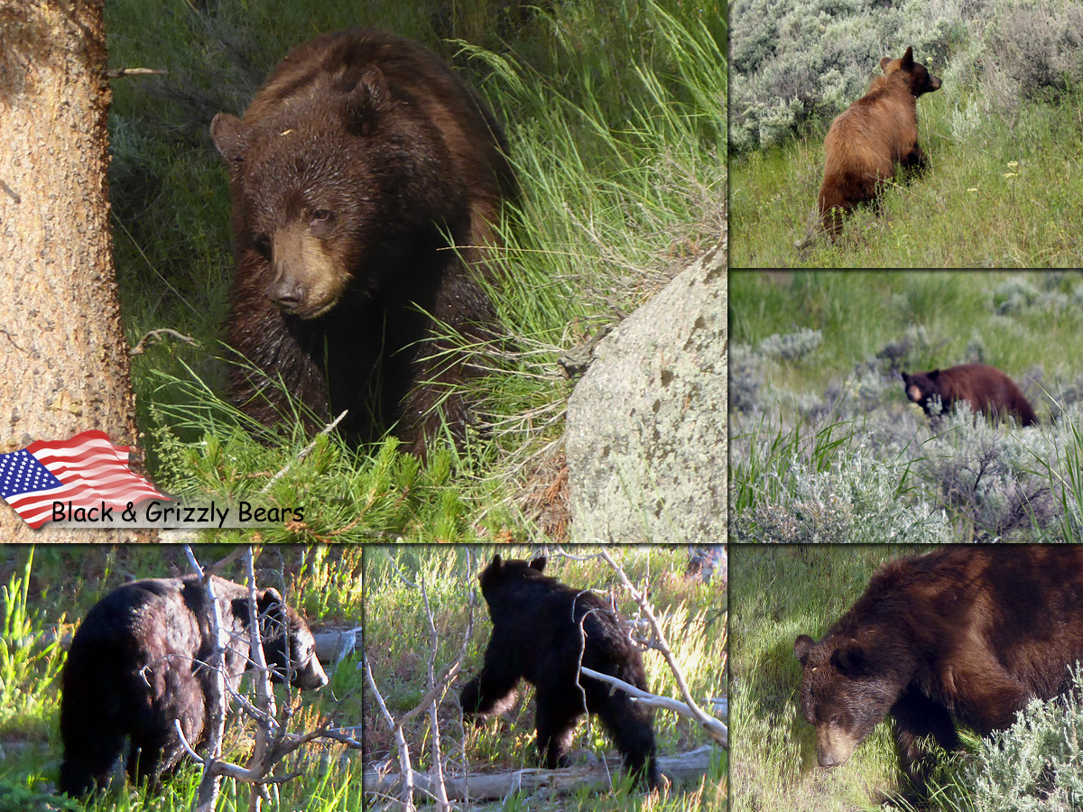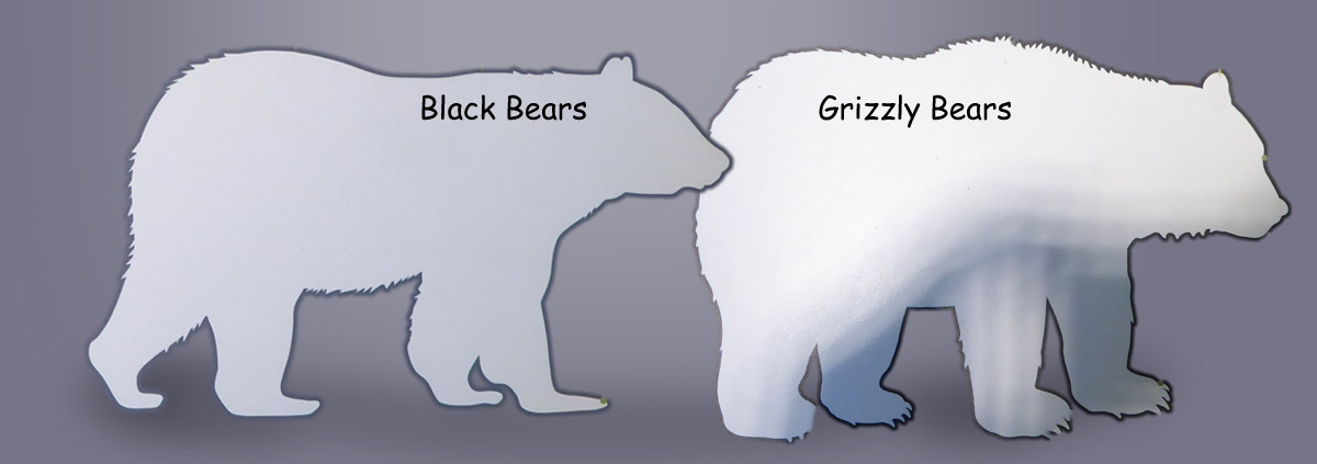 Despite apparent differences in size and colour, black bears and grizzly bears are often difficult to tell apart. Black bears can be black, blue-black, dark brown, brown, cinnamon and even white. Grizzlies, likewise, may range in colour, from black to blond. Although grizzly bears are, on average, significantly larger than black bears, size is not a good indicator of which species is which. The best indicators are the size of the shoulders, the profile of the face and the length of the claws. The grizzly bear has a pronounced shoulder hump, which the black bear lacks. Black bears have a flatter, “Roman nose” profile, larger ears, no visible shoulder hump and smaller claws.